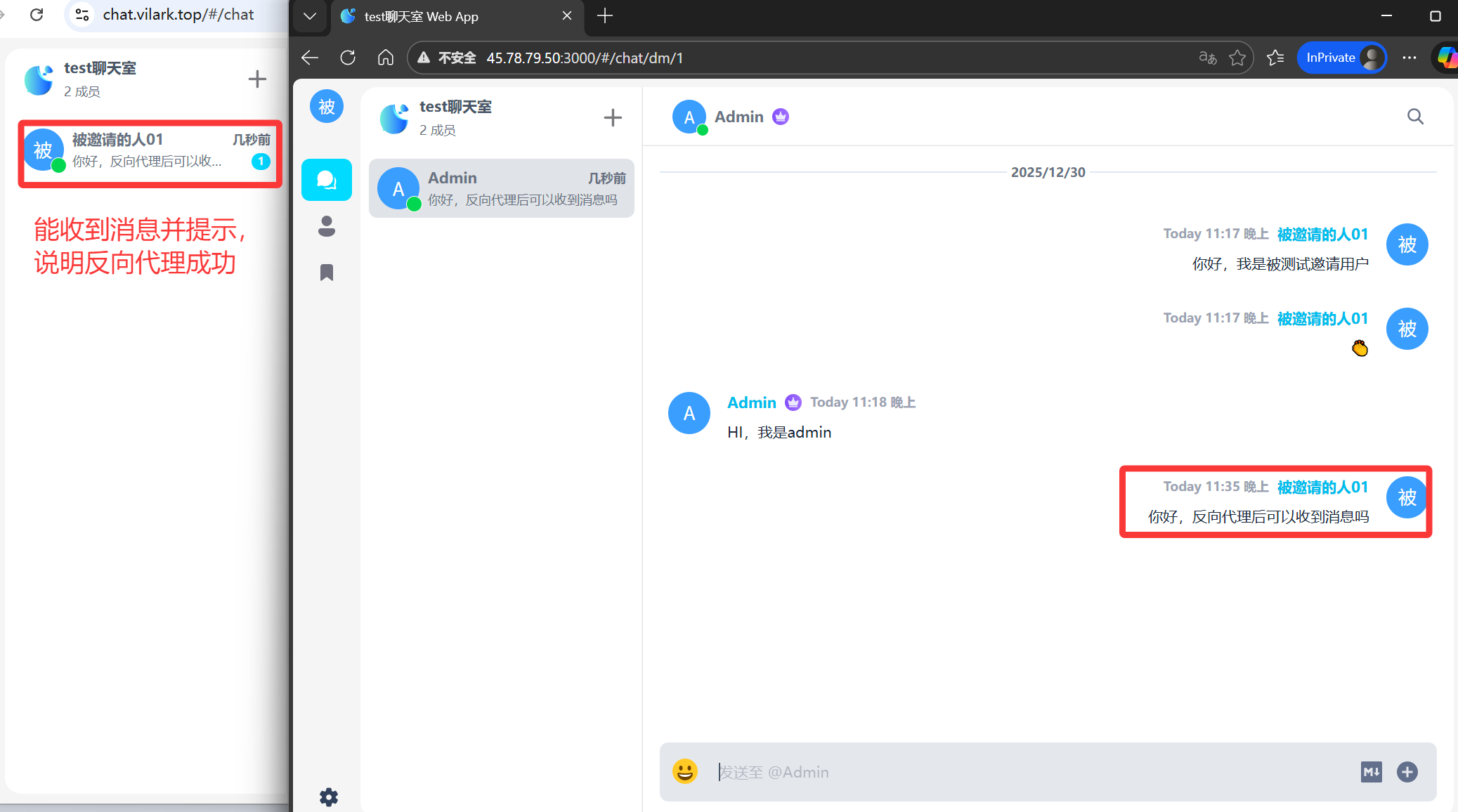 3.3.2 消息收发: 发送消息无延迟,对方能即时收到(验证 WebSocket 正常)。