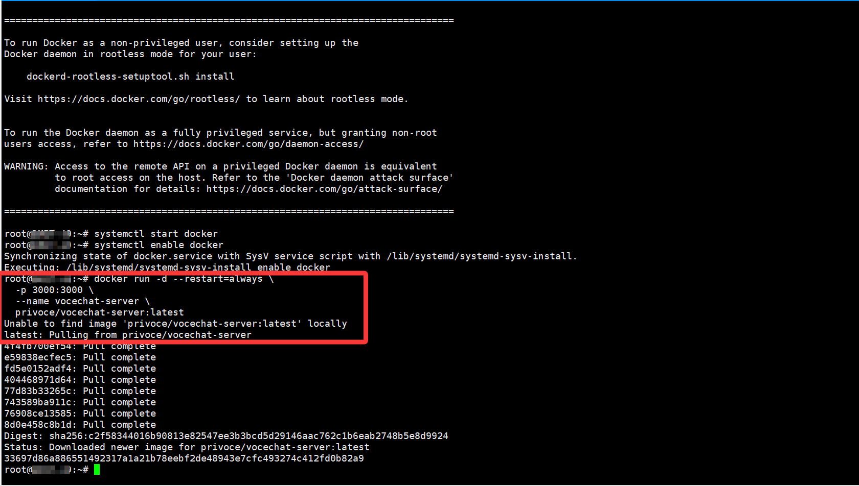 docker run -d --restart=always \ -p 3000:3000 \ --name vocechat-server \ privoce/vocechat-server:latest