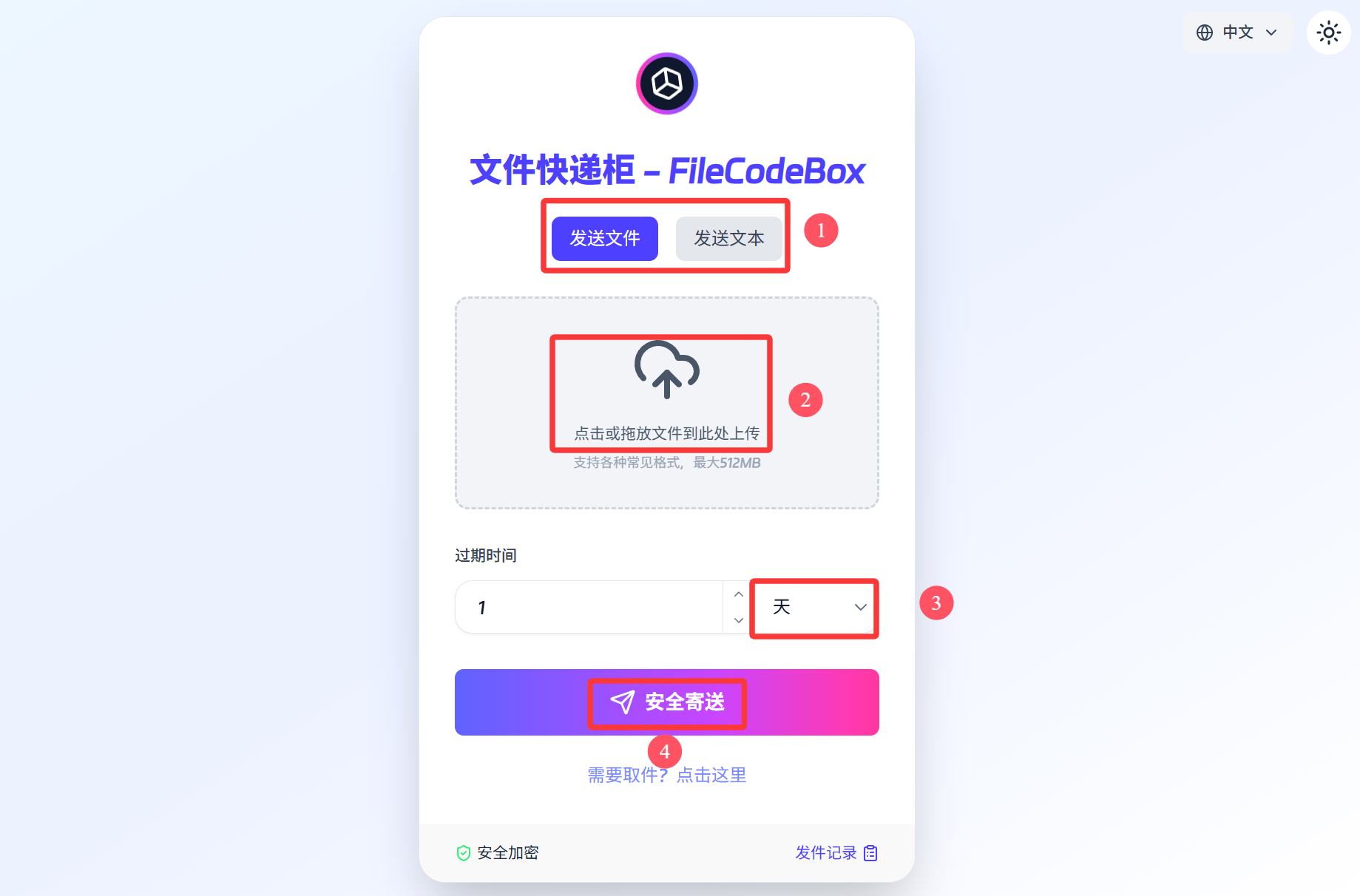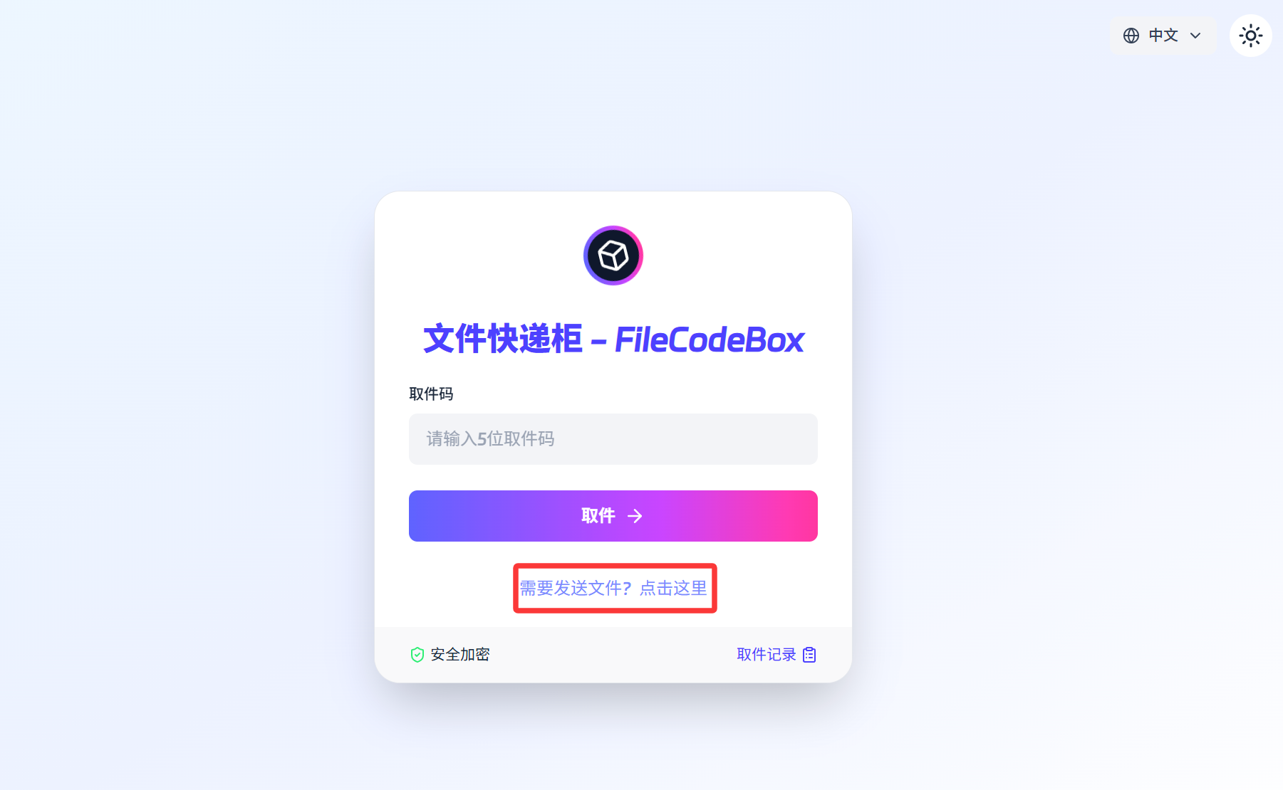 1.1 FileCodeBox默认界面是取件页面,点击要发送件,到发送文件页面