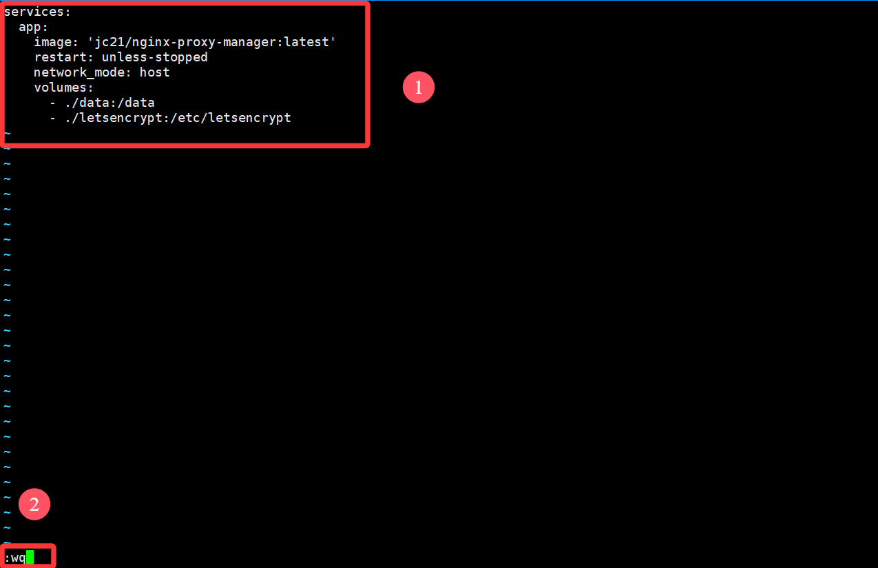 在 nginx-proxy-manager 目录下,执行下方命令,创建一个 docker-compose.yml 文件: