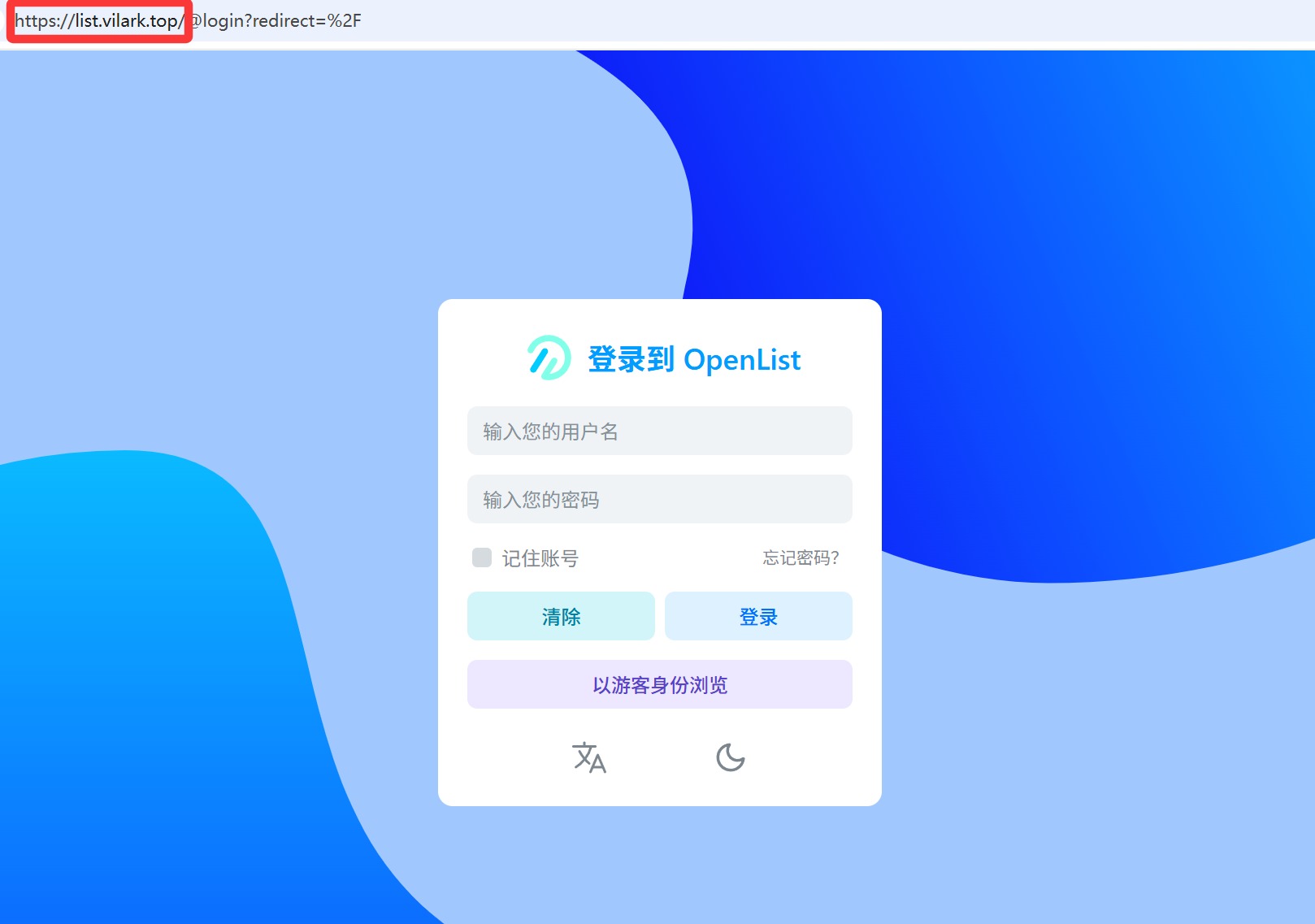 完成设置后,访问用于反代的域名,可以看到 openlist 登录界面。
