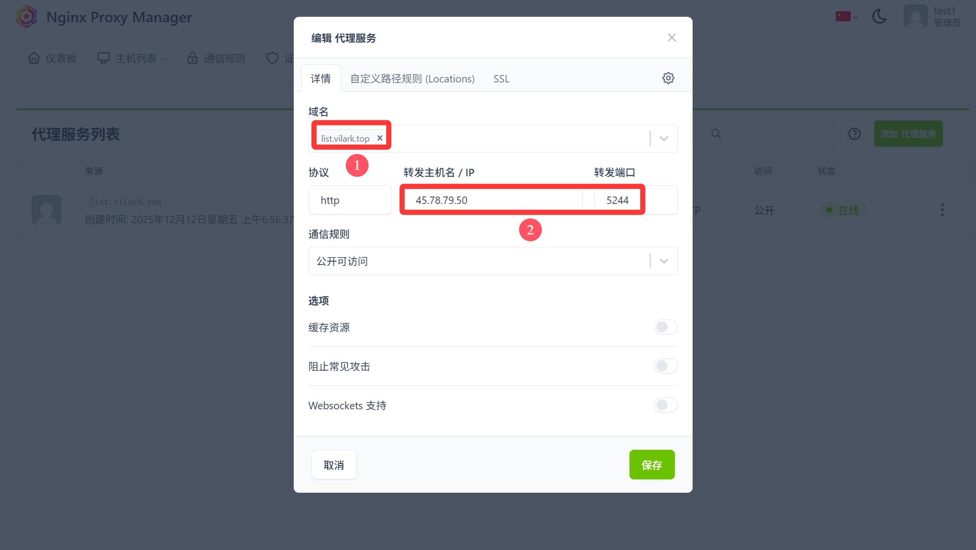 在「详情」选项卡,「域名」填写用于反向代理的域名,「转发主机名/IP」填写后端服务的 IP 地址或域名(因为 OpenList 部署在同一台服务器上,这里使用本地地址 127.0.0.1),「转发端口」填写后端服务的端口( OpenList 是5244)。