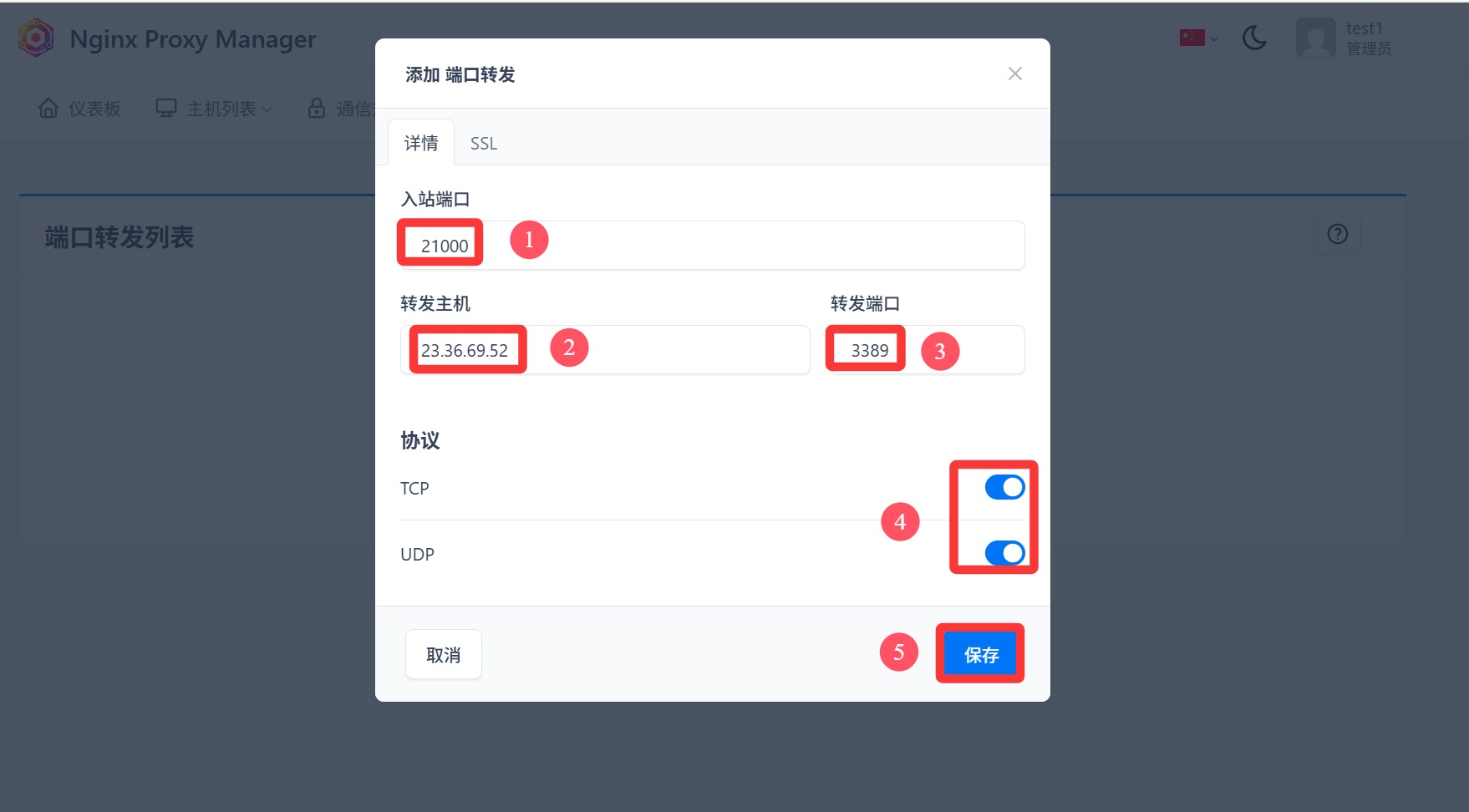 然后填写参数信息,「入站端口」填21000,「转发主机」填写需要远程的 Windows 主机的实际 IP 地址。「转发端口」填写远程服务端口(RDP的默认端口是3389)。「协议」因为 RDP 连接同时支持 TCP 和 UDP,因此请将 TCP 和 UDP 都打开,以获得最流畅的远程体验。