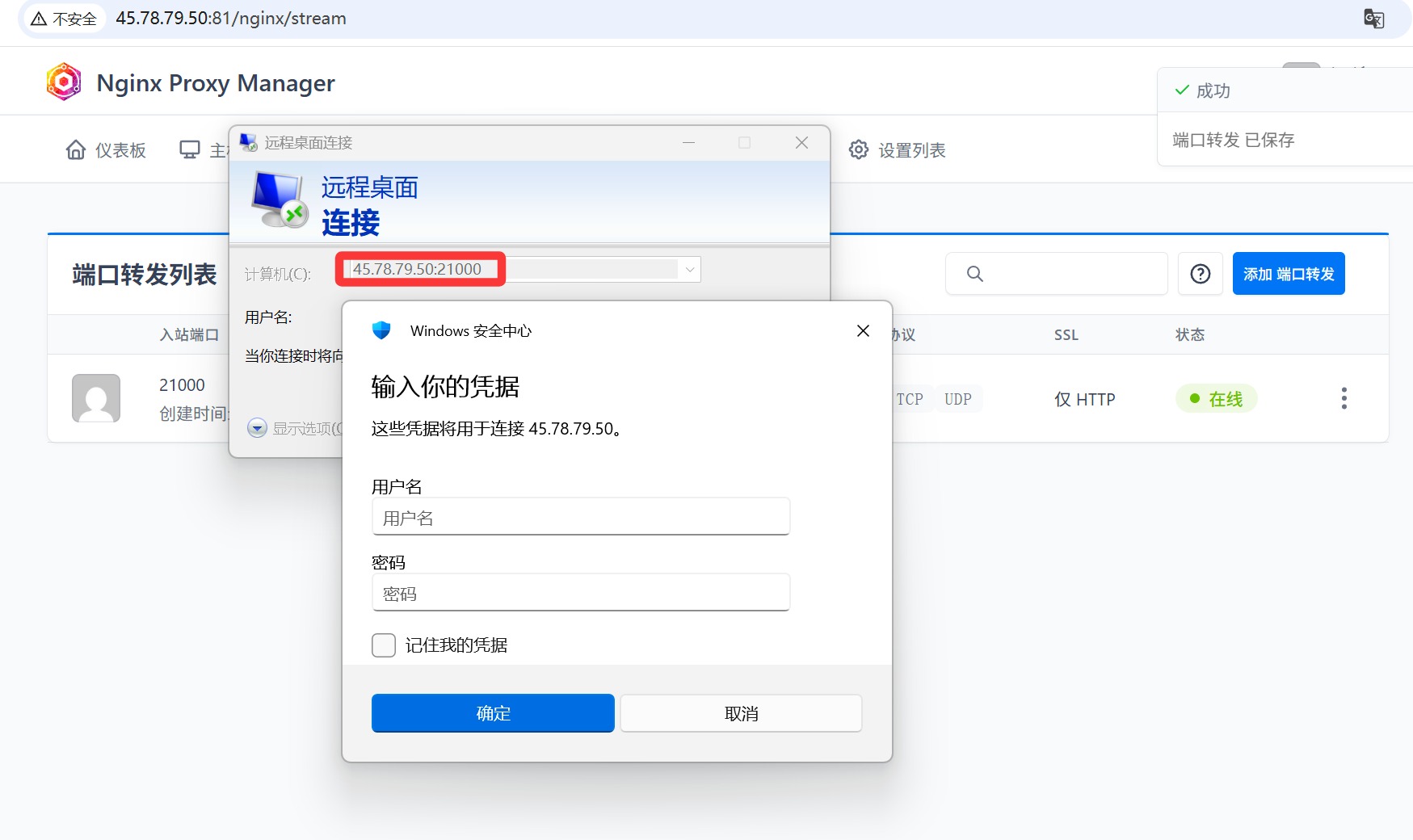 设置并保存后,您现在可以通过访问 搬瓦工IP地址:21000 来连接到您的 Windows 主机。